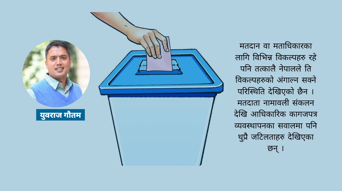सर्वोच्च अदालतले निर्देशन जारी गरेको पाँच वर्ष बितिसक्दा पनि विदेशमा रहेका नेपाली नागरिकले निर्वाचनमा भाग लिन पाउने सम्भावनालाई विगतका सरकारले प्राथमिकतामा दिनै सकेनन् । निर्वाचन आयोग र सरकारले संभाब्यता अध्ययन मात्र गरेको छ । कानून बनाएर प्रक्रिया अघि बढाएको छैन । मताधिकारको प्रयोग त गर्ने तर कुन विधि प्रक्रियाबाट गर्ने भन्ने प्रष्ट छैन । किनकी नेपालमै सबै नागरिकलाई मतदानमा सरिक गराउन निर्वाचन आयोगलाई हम्मे परिरहेको छ । विदेशमा रहेका मतदाता मतदान गर्न तोकिएको स्थानमा पुग्छन वा जुनसुकै भुगोलबाट भए पनि मतदानमा सहभागी हुन्छन् भन्ने प्रश्न गम्भीर छ । विदेशको कुरा छाडौं स्वदेशमै रहेका कति मतदाता मत खसाल्न जान्छन वा निर्वाचनमा सहभागी हुन्छन्, यो अध्ययनको विषय हो ।
