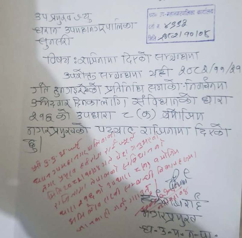‘यही २०८२ साल फागुन २१ गते हुन गइरहेको प्रतिनिधिसभा निर्वाचनमा उम्मेदवार हुनका लागि संविधानको धारा २१६ को उपधारा (८) (क) बमोजिम नगरप्रमुखको पदबाट राजीनामा दिएको छु।’